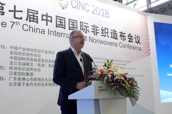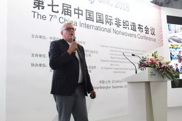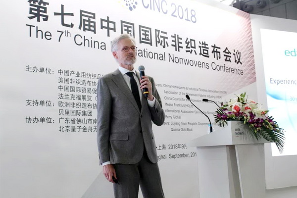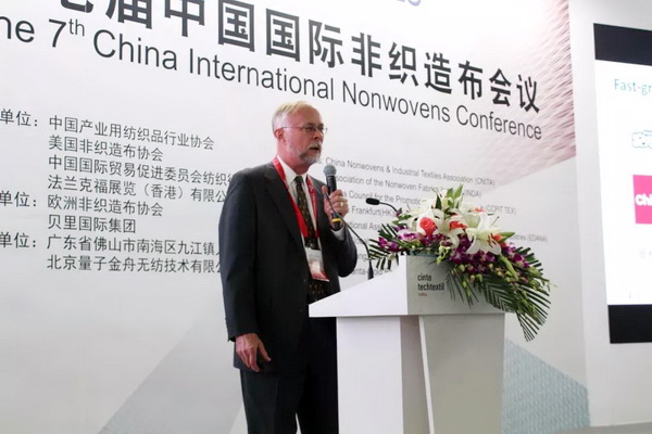 法蘭克福展覽有限公司產業用紡織品及紡織加工品牌總監Michael. Janecke致辭時表示,CINTE一直致力于為全球產業用紡織品企業搭建公開公平公正的交流平臺,本屆展會,海外展商的數量達到歷史新高,他們也帶來了領先的創新產品,可以與國內產業用紡織品企業進行更全面的貿易交流。盡管當前國際形勢比較復雜,但非織造材料依舊保持了良好的發展前景,市場需求不斷提升,市場驅動后勁十足。 Michael Janecke表示:“目前,70%功能性非織造材料的功能尚待完全開發,雖然說網絡媒體日漸發達,但我們依舊需要面對面的交流,去碰撞出更多的合作伙伴和創新想法,今天召開的第七屆中國國際非織造布會議將從市場趨勢和產品應用兩個方面探討行業發展,希望對于企業布局未來發展提供良好幫助。”